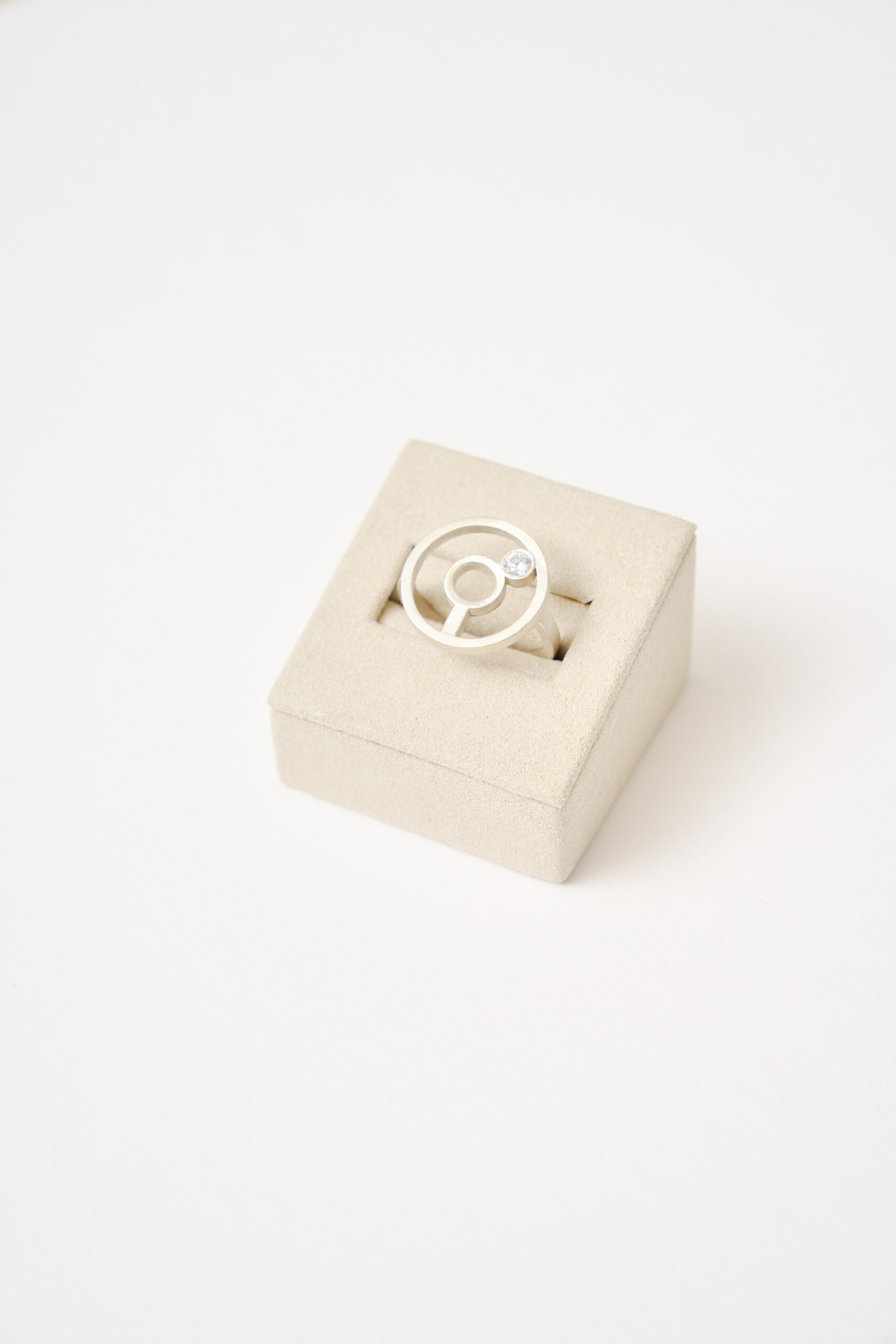 Anillo satelital diseñado artesanalmente con circonita uniendo los aros. Realza la mano con elegancia.