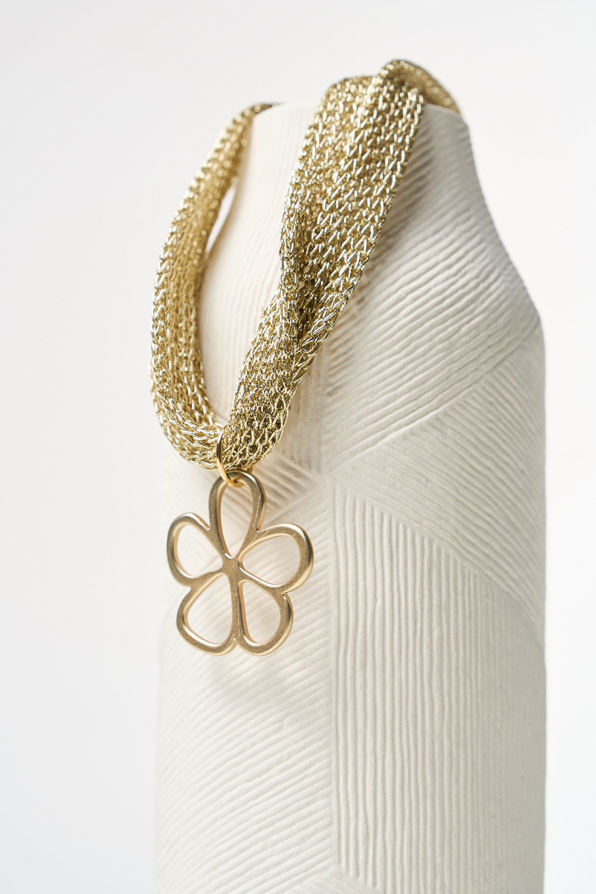 Collar corto de malla dorada suave y pieza central a modo de flor en color dorado mate. Muy facil de llevar y combinable con cualquier estilo. Medidas: 33cm. con extensión de 7cm.