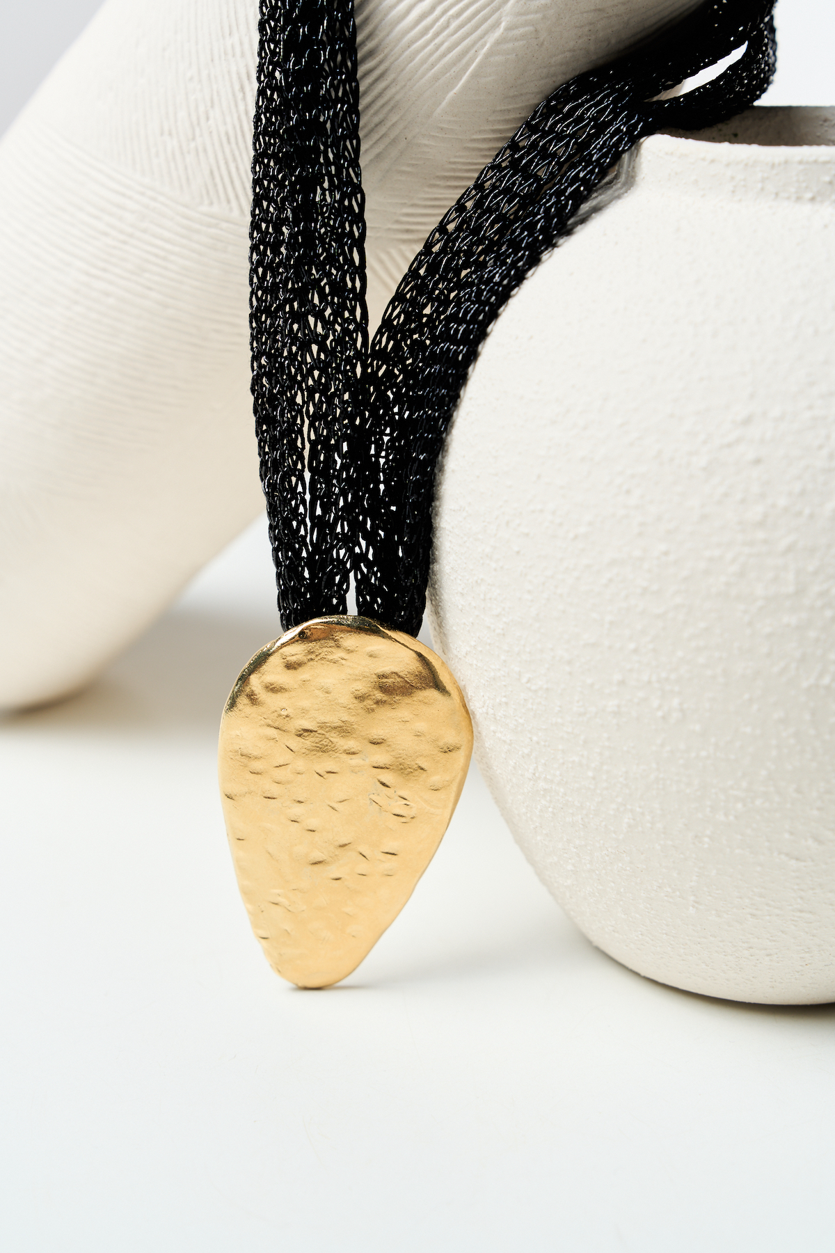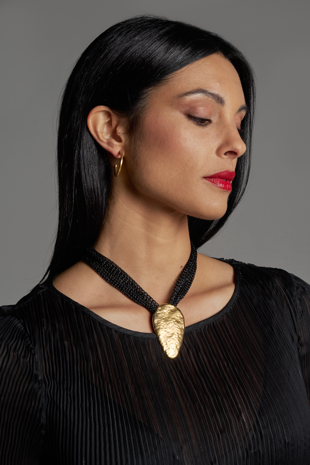 Collar corto de malla negra suave con gran pieza central a modo de gota. Material zamak con baño de oro de 23k. Elegante y facil de llevar. Medidas: 33cm. con extensión de 7cm.