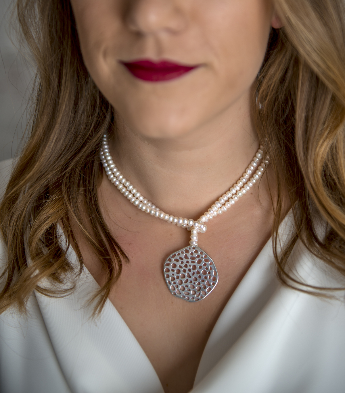 Elegantísimo collar corto con una tira doble de perlas de rio y original colgante en Zamak de 50 cm de largo