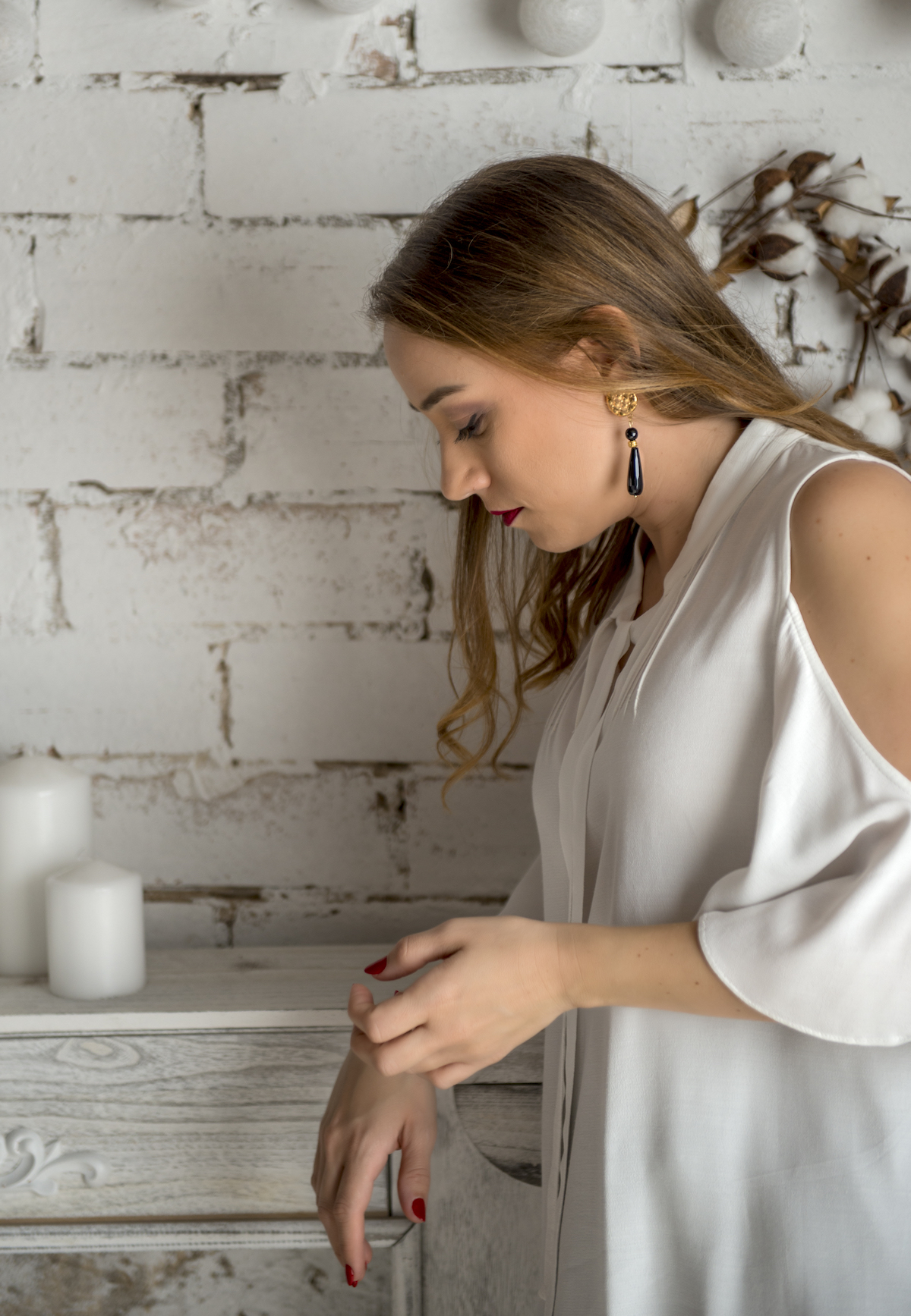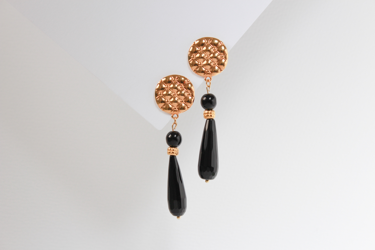 Elegante pendiente con base gravada y baño de oro de 24k. Colgante con bola y gota de onix. Cierre a presión. Largo de 7 cm